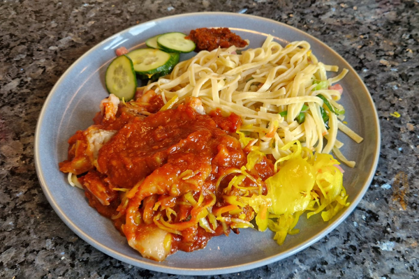 Babi Pangang, met krokant gefrituurd spek en een saus om je vingers bij af te likken.