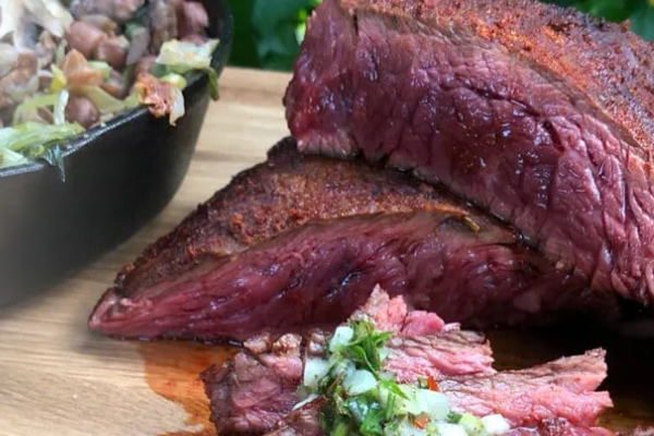 De robuuste smaak van bavette gaat perfect samen met het pittige zuurtje van de chimichurri.
