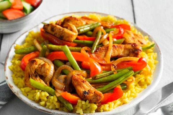 Serveer de piri piri groenten met de gebakken piri piri kip en de rijst.Â