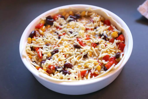 Deze Mexicaanse hartige taart is met mais en bonen.