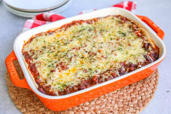Een taco ovenschotel met gehakt, bonen, paprika en mais.