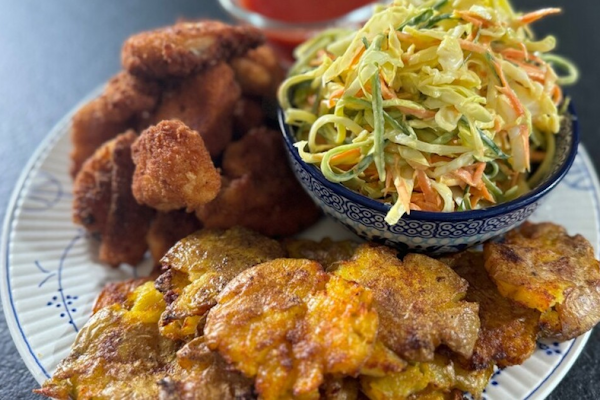 Zelfgemaakte kipnuggets, crispy krieltjes en groentespaghetti.