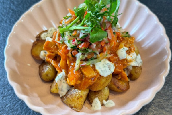 Kruidige pulled chicken, zoete mango en frisse ingelegde ui.