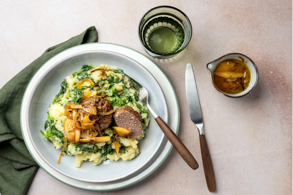 Knolselderijstamppot andijvie met boterzacht gestoofde sukadelappen.